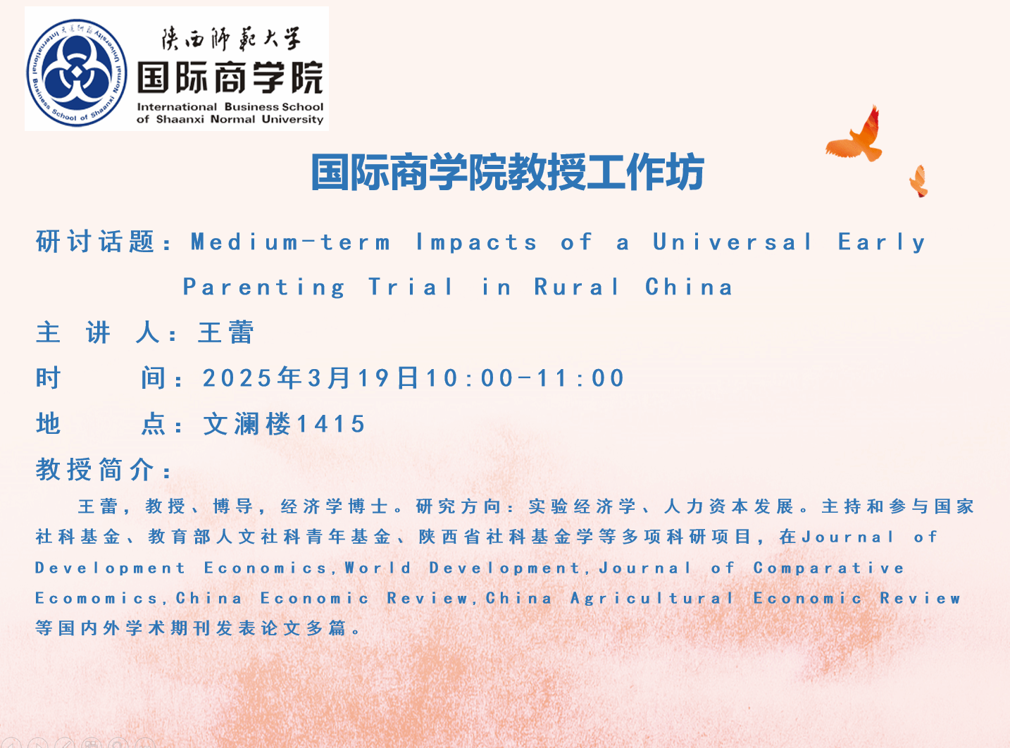 w66利来旗舰厅教授工作坊——Medium-term Impacts of a Universal Early Parenting Trial in Rural China