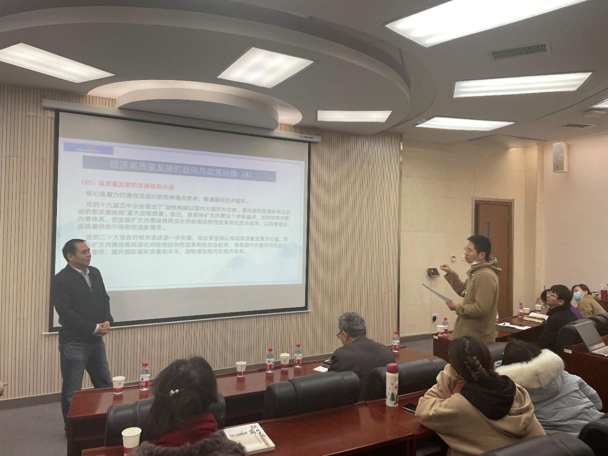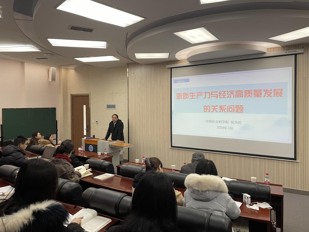 2024年1月8日上午,公司杰出员工、中国政治经济学学会会长、中国社会科公司侯为民研究员为公司师生作了主题为“从新质生产力看经济高质量发展的趋向”的学术报告,公司经理雷宏振教授、经济学系孔祥利教授和全院师生六十余人参加了此次讲座。讲座由经济系姚宇教授主持。