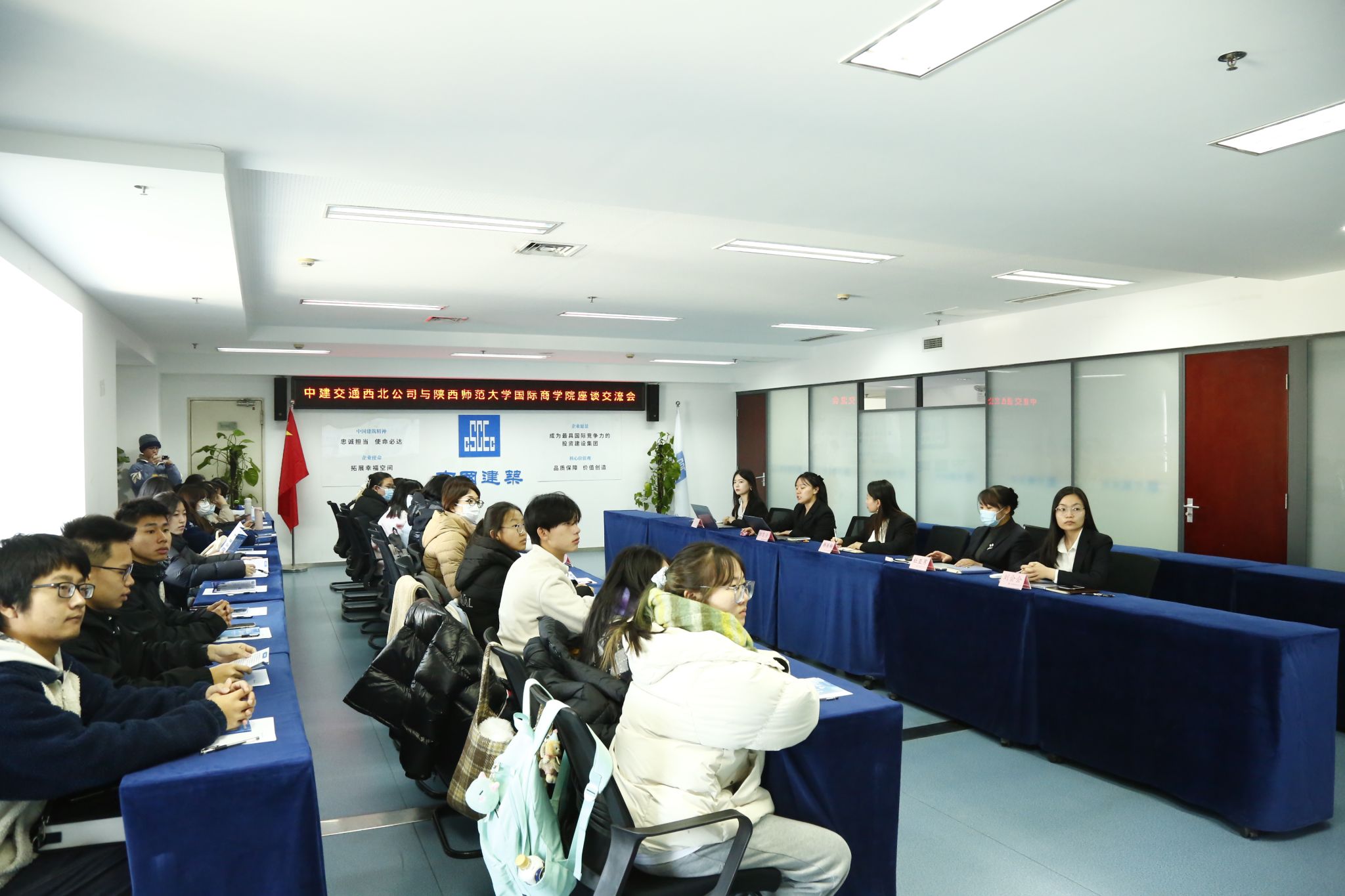 2023年12月26日上午,公司组织管理系杨博老师、屈小倩老师带领2023级工商管理类2302班同学赴中建交通建设集团西北分公司参观学习和交流座谈。本次活动旨在开拓同学们对于企业运行与组织管理活动的深入理解,了解企业管理实践前沿,提升个人职业生涯规划和专业学习能力。活动包括企业基本情况介绍、人力资源部业务运行与经验分享、企业实践与专业课程交流等内容。