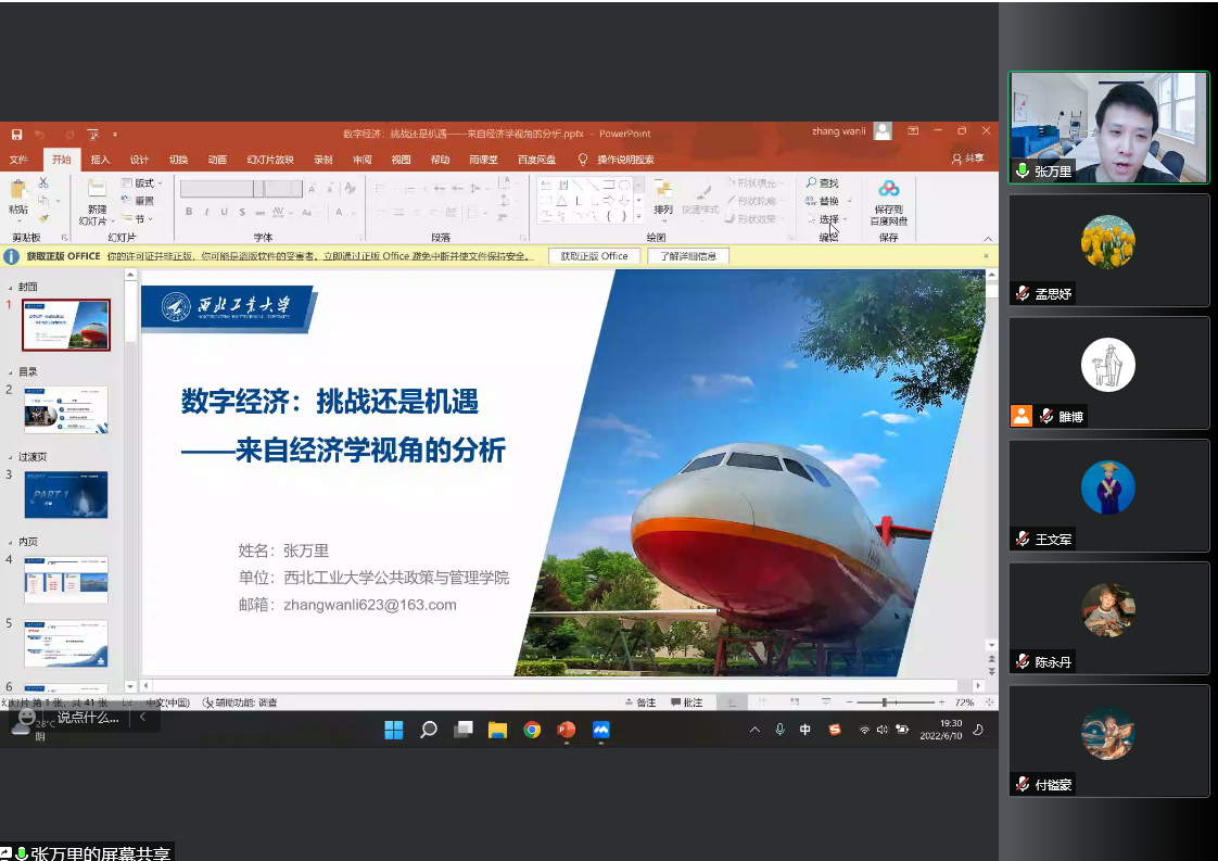 为了拓宽经济学专业员工视野,深入认识经济学,6月10日晚,公司于线上举办了第二十三期“经世论坛”讲座,讲座邀请了西北工业大学公共政策与管理公司张万里副教授做了《数字经济:挑战还是机遇——来自经济学视角的分析》的主题报告,从多个方面分享了现今数字经济的发展格局。讲座由经济学系主任王文军老师主持,来自经济学专业的本科生参加了此次讲座。