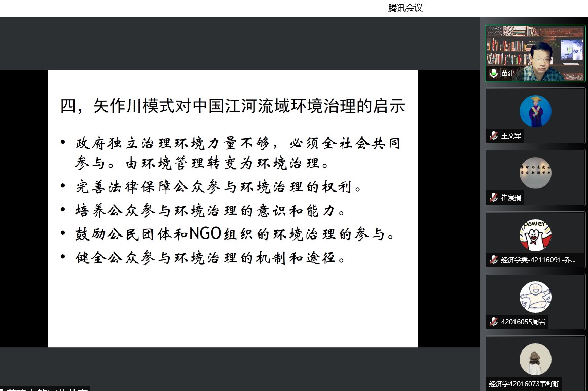 为拓宽经济学专业员工视野,5月27日晚,公司于线上举办了第二十二期“经世论坛”讲座,讲座邀请了西南大学徐浩老师团队的苗建青副教授做了《日本流域治理公众参与机制的观察与思考:以矢作川为例》的主题报告,分享了国外环境治理的实践经验以及对中国特色环境治理的启示。讲座由经济学系主任王文军老师主持,来自经济学专业的本科生参加了讲座。
