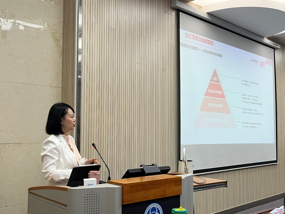 讲座伊始,林琳老师以“上市”为切入点,最先介绍了上市的本质、上市对公司的意义和对股东的好处,使同学们对“上市”有了更深入的了解。有了一定的铺垫之后,林琳介绍了企业发行上市的背景与制度,并从三大交易所视角、上市板块视角、全面注册制改革等多角度详细展开。其中,她重点介绍了同学们提问的北交所服务定位和“专精特新“的内涵,并强调了”中小企业是国民经济和社会发展的生力军,扶持中小企业具有重要意义“。接着,她详细解读了审核标准与新规,帮助同学们把握企业发行上市的要点、理解各板块多元化的上市标准。此外,她还分析了市场概况与数据大板块,让同学们更好地理解各板块对上市公司要求的差异性以及不同行业、不同地域近年的发展情况。