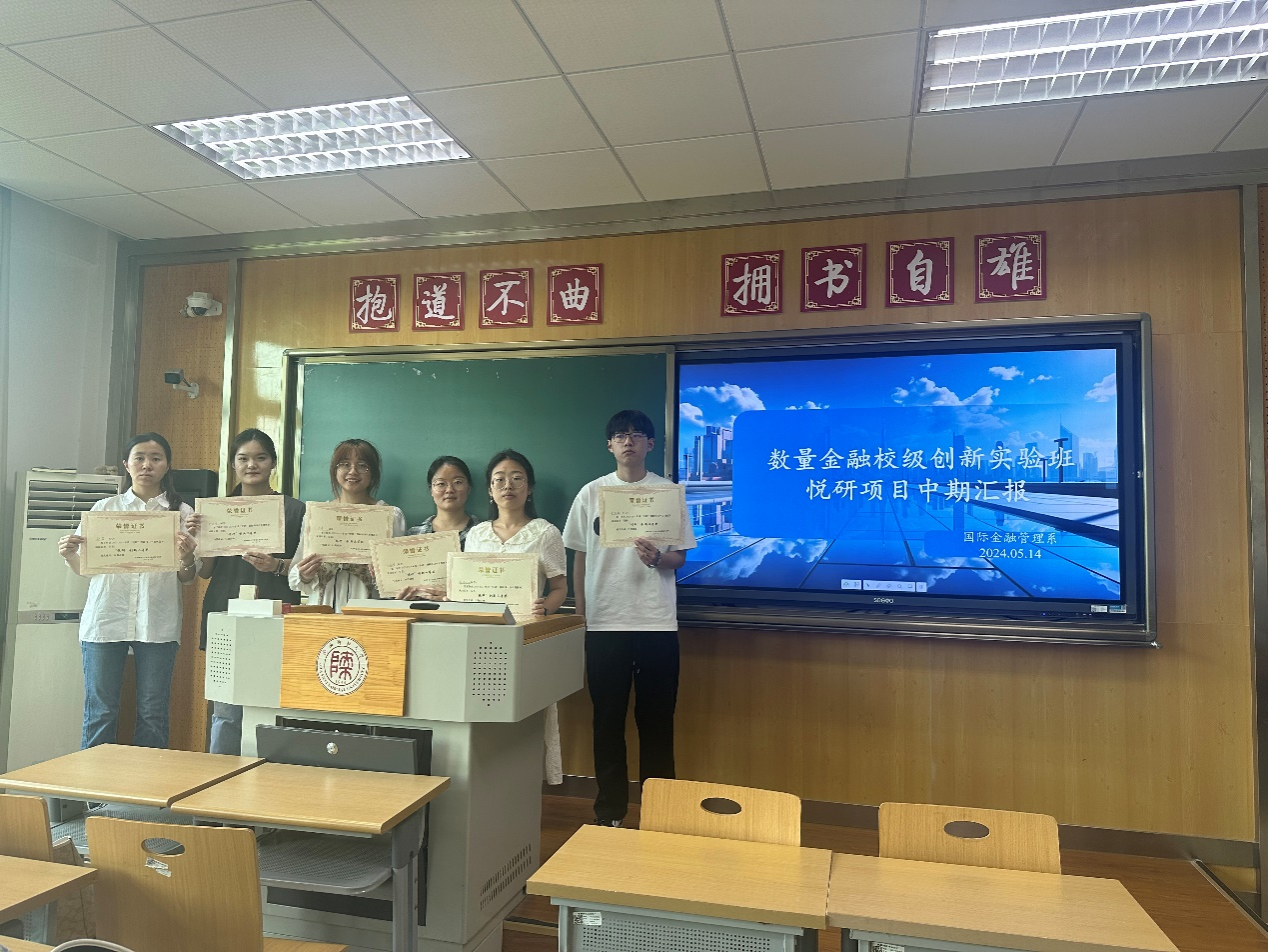 2024年5月14日下午,国际金融管理系在文澜楼1420组织了数量金融校级创新实验班“悦研”项目中期成果评审汇报。本次活动邀请了贾妮莎、刘杰、吴炳辉、薛晴、张嘉望、王珏六位老师作为评委对创新实验班同学的中期汇报进行评审,为同学们指出问题,指导下一步研究计划。