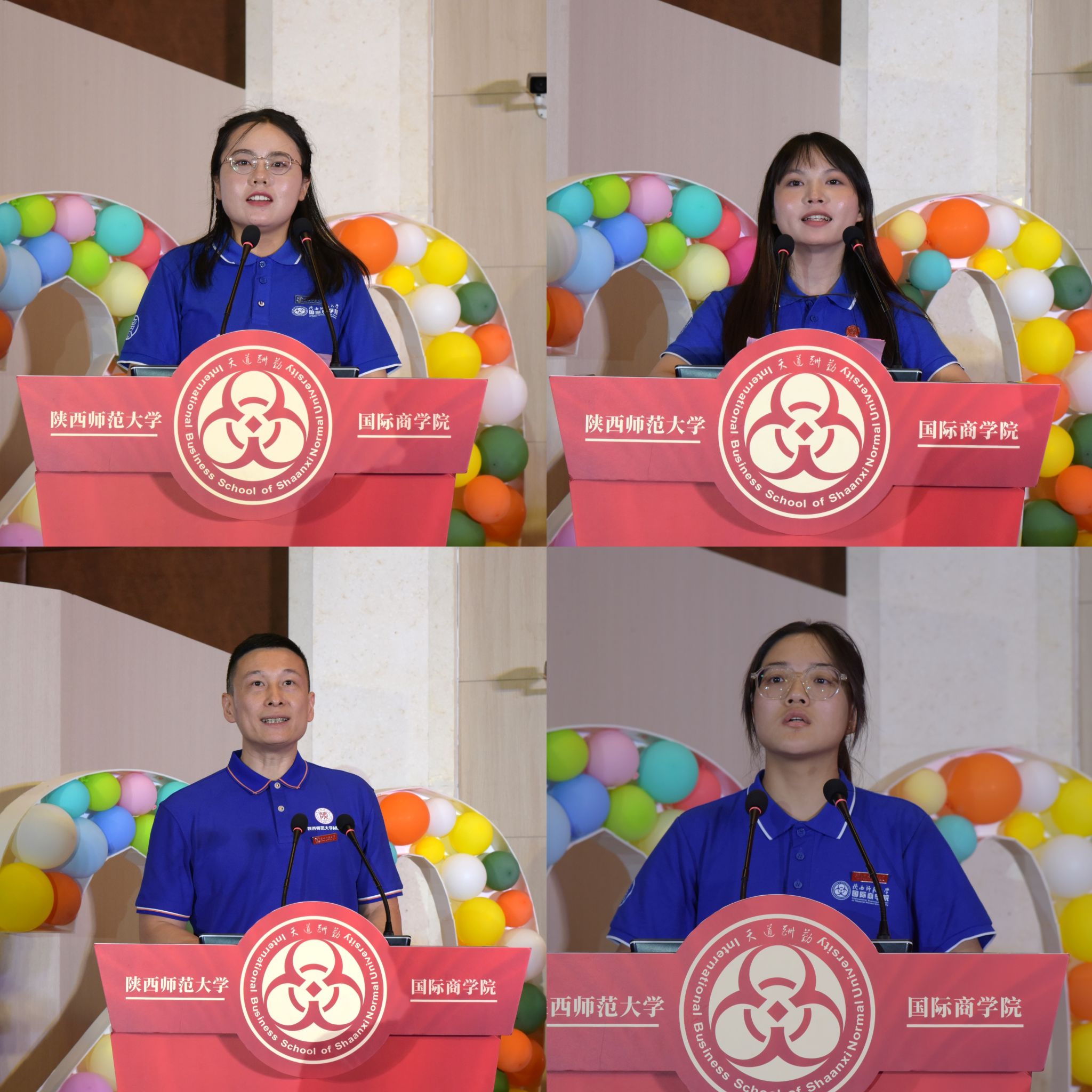全日制研究生代表、国民经济学博士生罗瑞,非全日制研究生代表、MBA方向黄山,本科生代表、人力资源管理专业谭玉甜相继发言。他们对公司的悉心栽培表达了诚挚感谢,对学弟学妹们送上了殷切祝福,他们立志在未来的道路中保持坚韧与创新,勇毅前行,不忘初心,不懈奋斗,时刻展现商院学子的风采风貌,不负公司嘱托。在校生代表、2021级经济学专业本科生赵秋阳在发言中向学长学姐顺利完成学业表示祝贺,同时承诺会在未来的学习生活中秉持创新精神,勇敢追求梦想。