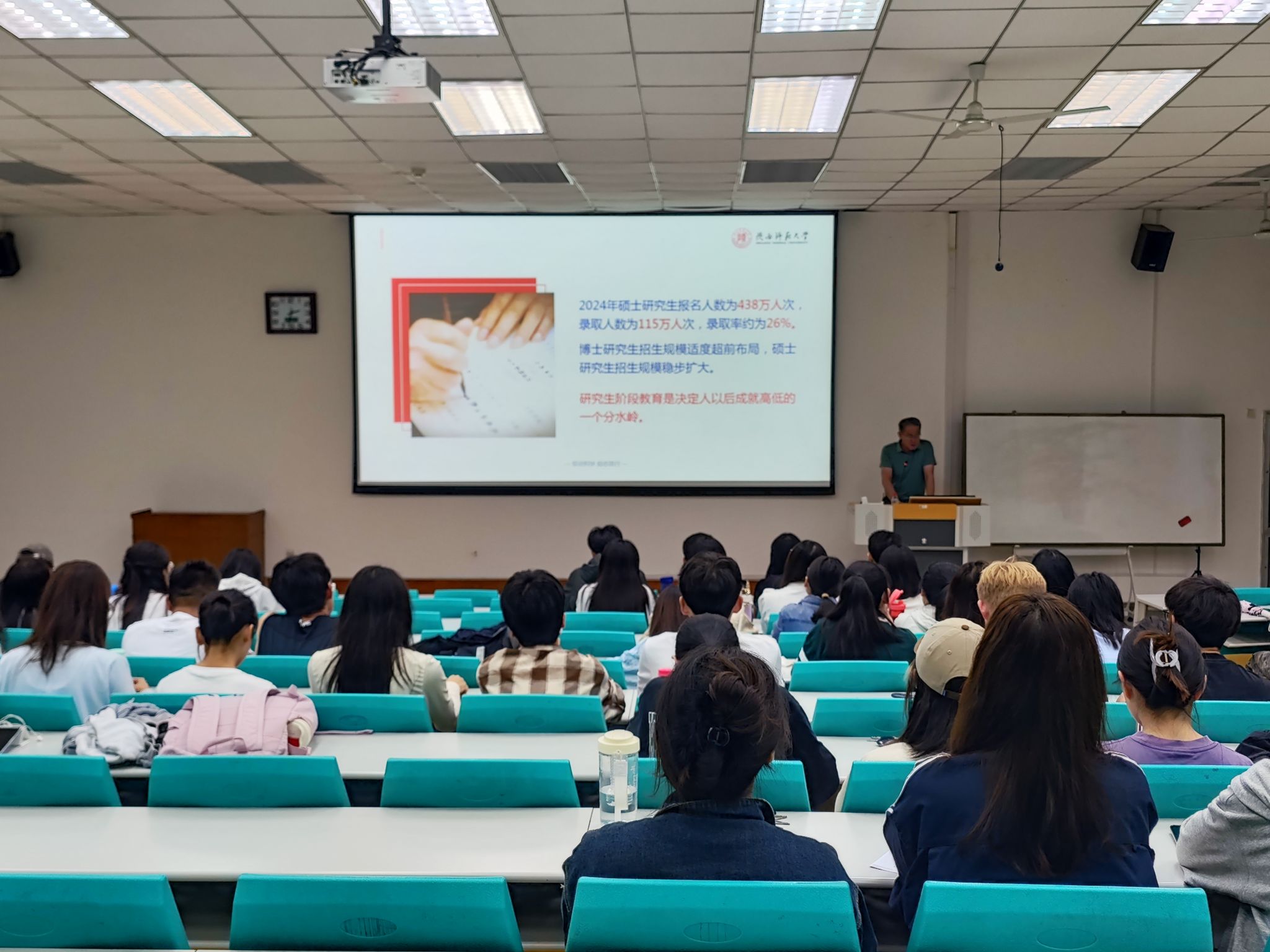思培峰从研究生招生规模与录取数据入手,强调了研究生阶段教育在个人成就方面的重要性。接着,他展开分析了研究生思想成熟、认知能力强、科研任务重等特点和在课程学习、时间管理、思想政治素养、团队与社交等方面的生活模式并提出了两点建议:一是要通过参加学术会议、学术交流活动等不断开拓学术视野;二是要做好时间管理,合理安排自己的课程、学术及生活。随后,思培峰就研究生“如何通过强化思想政治引领成为党和国家的高层次人才”提出几点要求:一是要用党的科学理论武装头脑,不断坚定政治立场;二是要充分利用科研实践平台,提升科研水平和创新能力;三是要自觉接受学术道德教育,强化自身道德修养