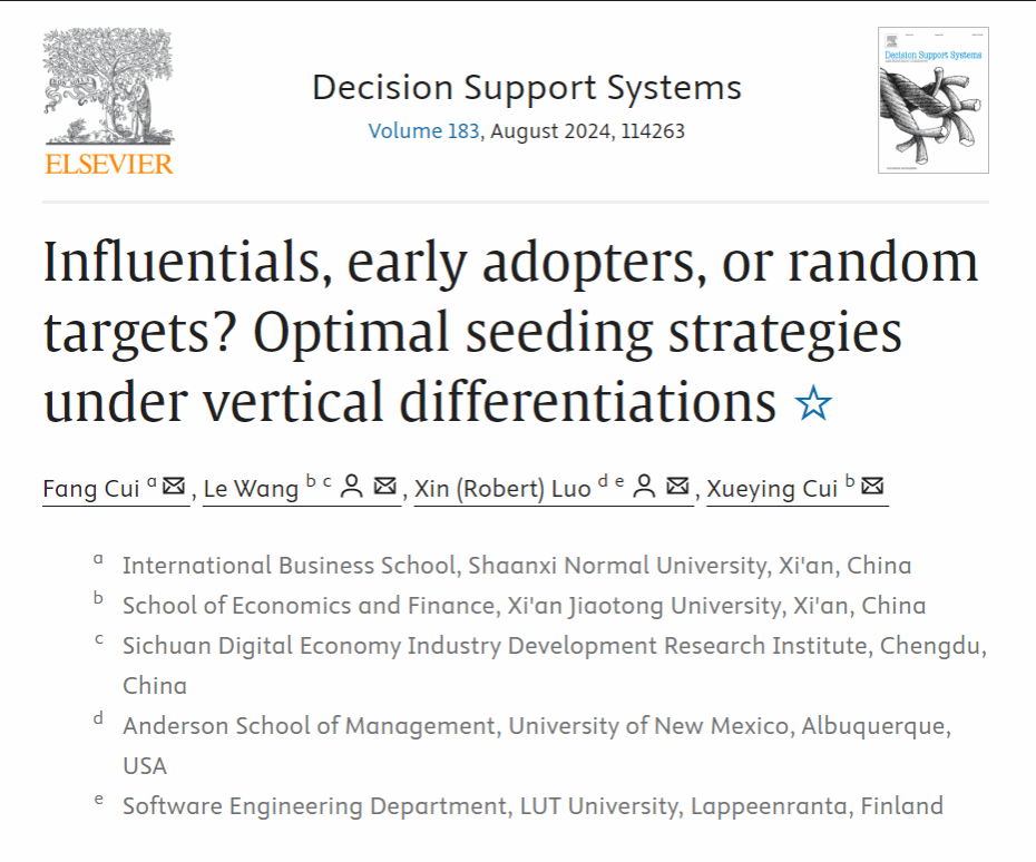公司崔芳老师在Decision Support Systems国际TOP期刊中发表论文“Influentials, early adopters, or random targets? Optimal seeding strategies under vertical differentiations”,论文研究了在垂直差异化市场中,选择最佳种子用户策略(影响者、早期采纳者或随机目标)来推广新产品的关键在于平衡消费者传播负面口碑的可能性以及产品的质量和品牌实力。