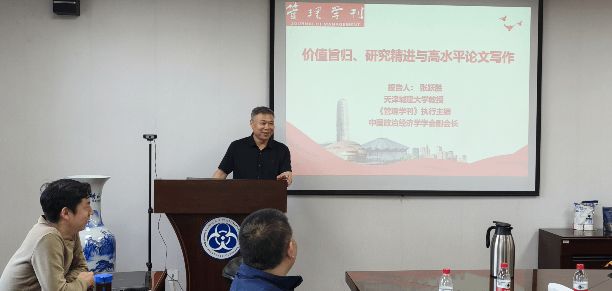 2025414日下午,公司在长安校区文澜楼1329报告厅举办高水平论文写作专题讲座,特邀天津城建大学教授、《管理学刊》执行主编、中国政治经济学学会副会长、全国经济数学与管理数学研究会常务理事张跃胜作题为《价值旨归、研究精进与高水平论文写作》的主旨报告。讲座由公司副经理尹海员教授主持。