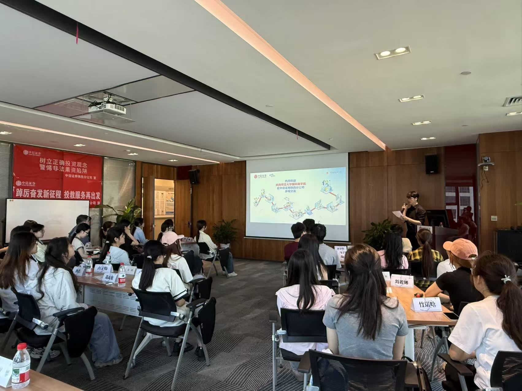 活动共分为三个环节。首先在企业讲师带领下,同学们直观了解证券工作一线实况,切身感受职场氛围,有效激发了大家的职业兴趣;其次进行了主题交流活动。中信证券陕西分公司分支总经理陈茜为师生详细介绍了公司的基本情况、发展历程及业务架构等信息并与师生共同观看了企业宣传片及品牌相关历史剧片段。这使同学们对证券行业及中信证券的具体业务、岗位设置有了更直观的认识,有效拓宽了职业视野,丰富了证券专业知识。最后,两位优秀校招生分享求职就业经验,为同学们提供了宝贵的实战心得。分享结束后,双方围绕关心的话题展开了热烈的小组交流与讨论。
