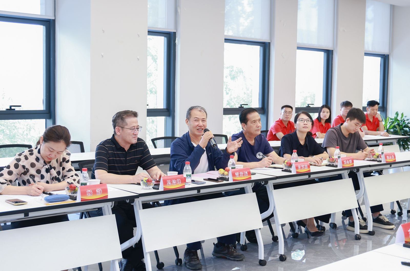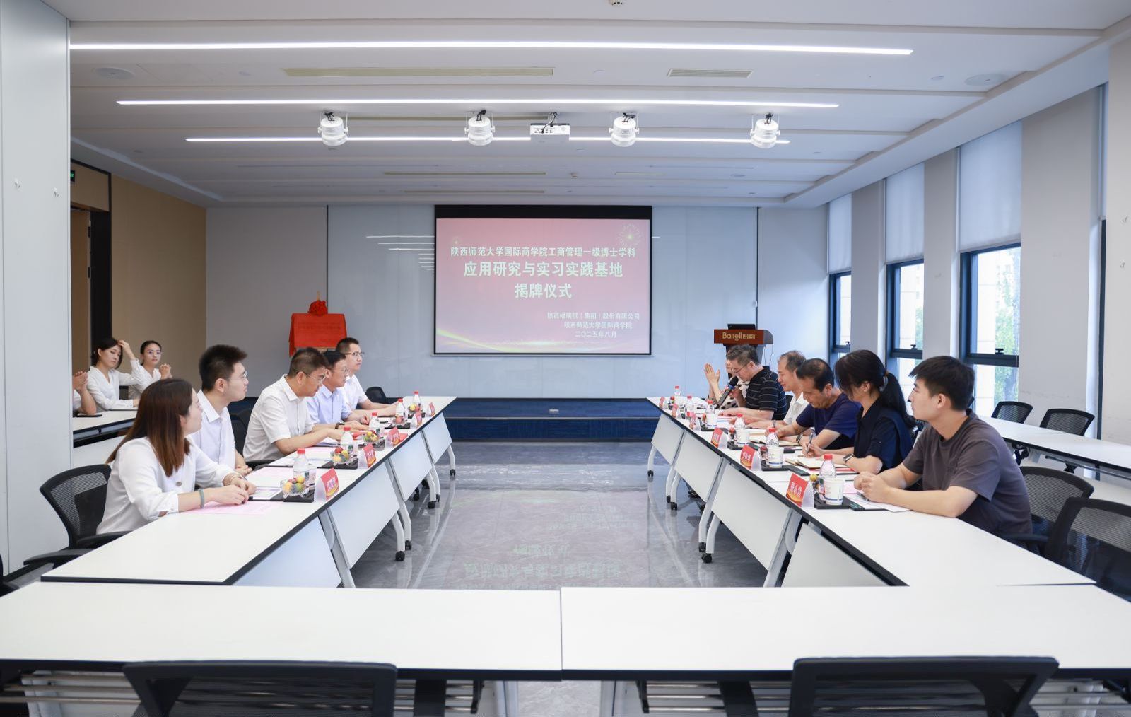 雷宏振一行与福瑞祺集团相关人员进行了座谈交流,座谈会由思培峰主持。座谈会中,福瑞祺集团董事长唐宁波致欢迎词,他表示,应用研究与实习实践基地揭牌是福瑞祺集团发展历程中的重要里程碑,集团期待通过与公司的深度合作,将基地打造成“管理创新试验田、人才培养蓄水池、成果转化加速器”,为高校的人才培养添砖加瓦,为集团的高质量发展注入强劲动能。