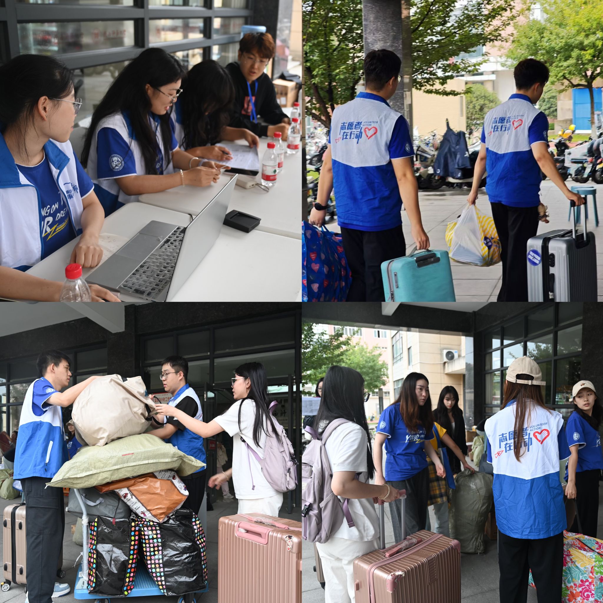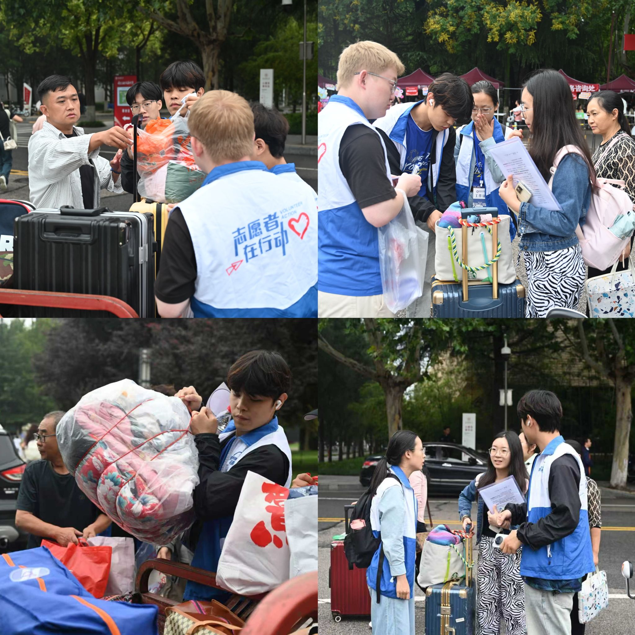 校门接应组手举迎新牌,穿梭在人群之中,率先点亮新生踏入校园的初印象。帐篷签到组早已准备就绪,志愿者们精心布置签到处,用清晰的指引和贴心的提示,帮助新生准确定位,并为他们发放校园卡和校徽。行李搬运组的志愿者们手提肩扛,穿梭于校门与楼宇之间,用实际行动向新同学们表达了最热烈的欢迎。