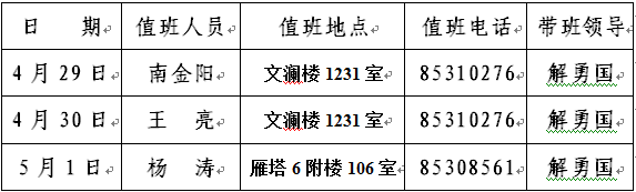 值班时间:上午:8:30—11:30,下午:14:30—17:30。