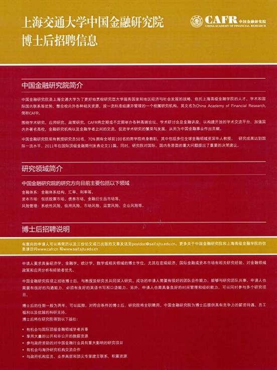 上海交通大学中国金融研究院,是上海交通大学的校属研究机构,依托于上海高级金融公司,拥有全球化的金融研究平台以及国际化的专家学者团队。公司现正招收博士后,加入到教授及研究员的团队中,致力于金融体系、资本市场、风险管理等领域的研究。现该院拟从公司即将毕业的博士生中招收,专业涉及:经济学、金融学、统计学、数学或其他相关领域,尤其需要在宏观经济、国际金融或资本市场有相关研究经验的优秀博士。