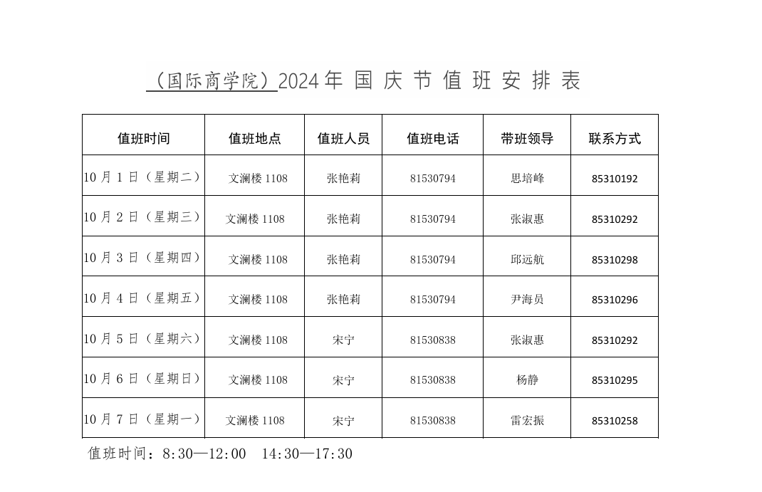 w66利来旗舰厅2024年国庆节值班安排表